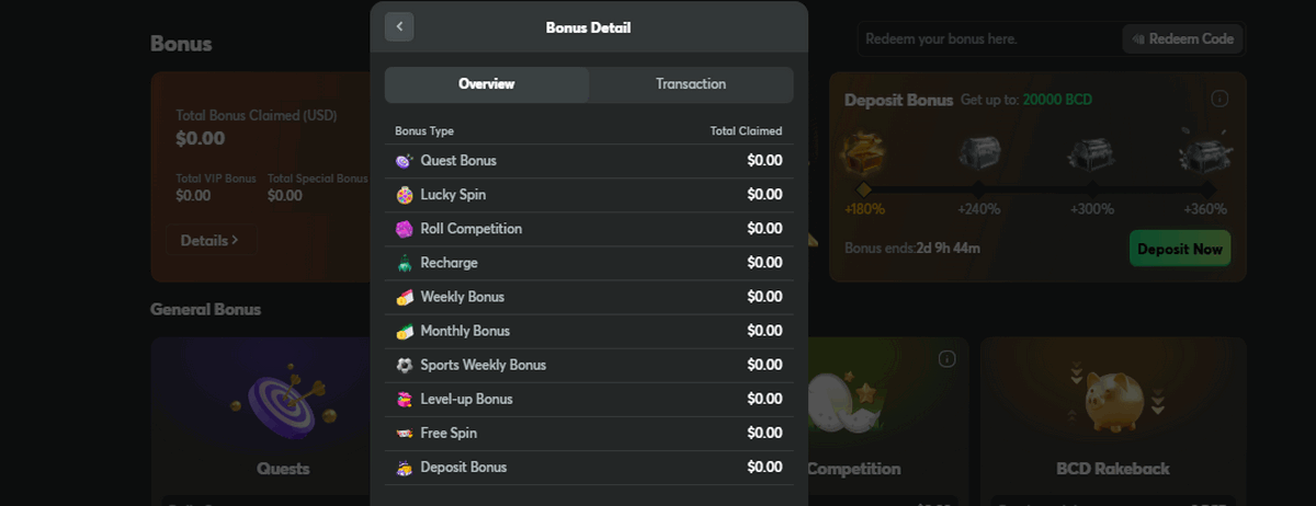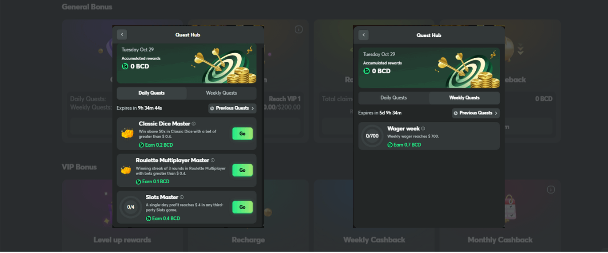 | Weekly | Wager Week | Reach a total wager of $700 across all games within the week. | 0.7 BCD | Consistently place bets throughout the week to achieve the cumulative wagering requirement. |