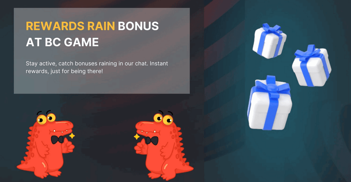 - Constant Chat Rains and Coin-Drops. These rewards are given for active participation in the platform’s chat rooms and are quickly claimed by the most responsive users.