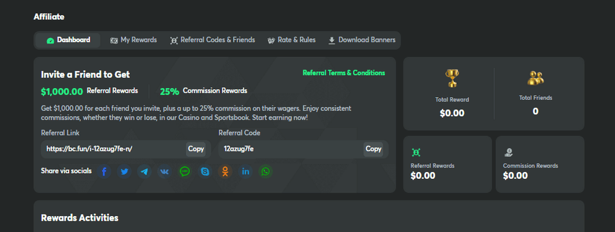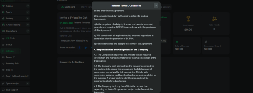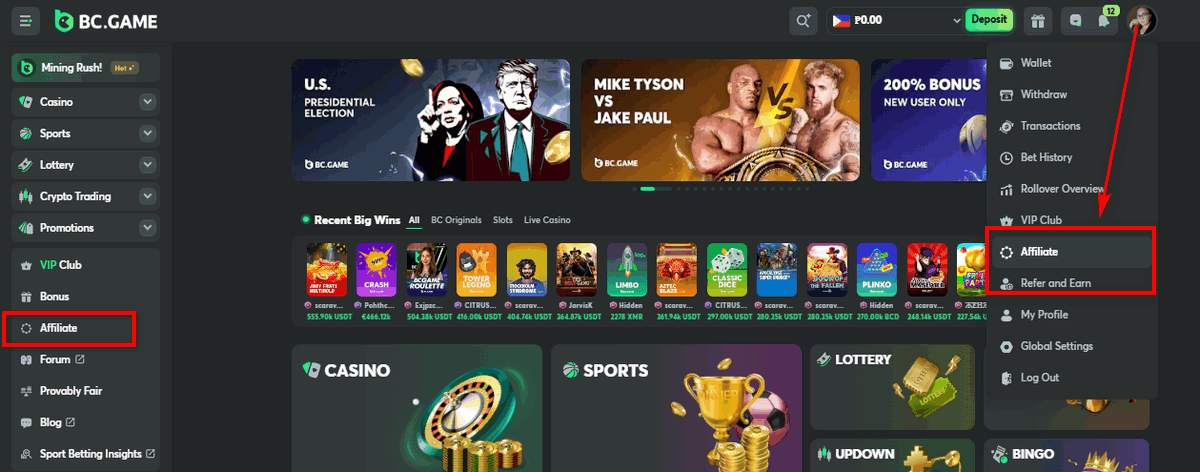 Once you log in to your BC.Game account, head over to the “Affiliate” section. This can be accessed through your dashboard or by following a specific link provided by BC.Game, making it more convenient to discover and use.