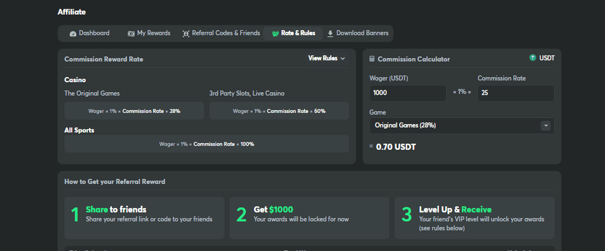 - Accumulation. Referral bonuses grow as your referrals actively engage in platform games. Each referral can earn you up to $1,000, with a commission rate up to 25% on their wagers.